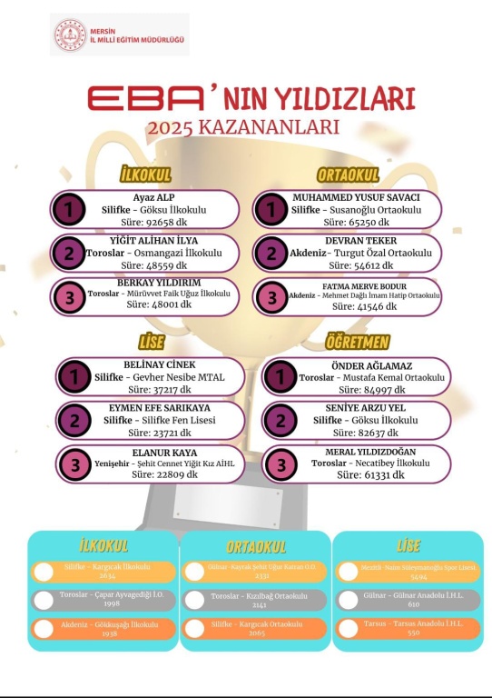 Mersin Milli Eğitim Müdürlüğü tarafından düzenlenen“EBA’nın Yıldızları 2025” yarışmasının sonuçları açıklandı. Mersin İl genelinde öğrencilerin EBA platformunu en verimli kullandığı okulların belirlendiği yarışmada, Silifke Kargıcak İlkokulu İl birincisi, Kargıcak Ortaokulu ise İl üçüncüsü olarak büyük bir başarıya imza attı.Kargıcak İlkokulu, gösterdiği üstün performans ile EBA kullanım süresi bazında tüm ilkokullar arasında birinci sıraya yerleşti. Öğrencilerinin düzenli, bilinçli ve etkili dijital ders takibi bu başarıda önemli rol oynadı.Kargıcak Ortaokulu da EBA platformunu en etkin kullanan ortaokullar arasında üçüncü olarak adını zirveye yazdırdı. Öğrencilerin kararlılığı ve öğretmenlerinin rehberliği sayesinde bu önemli derece elde edildi.Başta okul yöneticileri, öğretmenler, öğrenciler ve veliler olmak üzere bu başarıya katkı sağlayan herkesi yürekten kutluyoruz.Eğitimde dijitalleşme yolunda emin adımlarla ilerleyen Kargıcak okulları, geleceğin öğrenme modellerine güçlü bir örnek sunmaya devam ediyor.